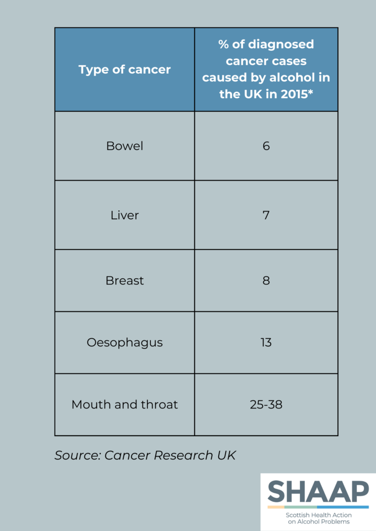 Alcohol is a group 1 carcinogen and the more alcohol a person drinks, the greater their risk of developing seven different types of cancer[1]: