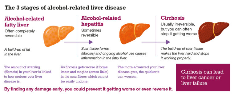 Alcohol is the biggest cause of liver disease in the UK, accounting for 6 in 10 cases of liver disease. Regularly exceeding the recommend UK alcohol guidelines increases the risk of developing liver disease and liver cancer. Alcohol-related liver disease (ArLD) has three stages, and up to 5% of people with cirrhosis will develop liver cancer:
