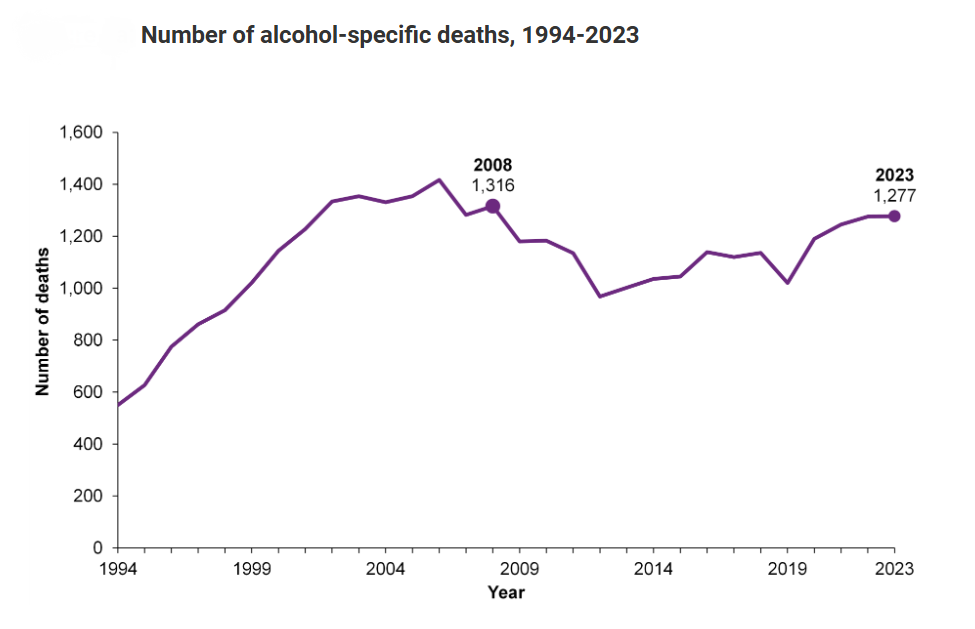 - There were 1,277 alcohol-specific deaths registered in Scotland in 2023, an increase of one death from 2022. This is the highest number of alcohol-specific deaths registered in a year since 2008