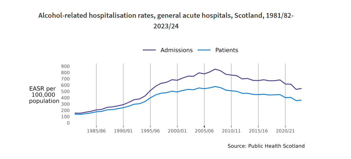 - In 2023/24 there were 32,301 alcohol-related hospital admissions (stays) in Scotland. The majority of alcohol-related hospital admissions (92%) occurred in general acute hospitals (29,829) with the remaining 8% of admissions (2,469) occurring in psychiatric hospitals.