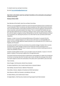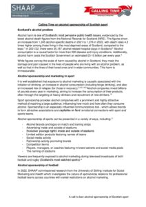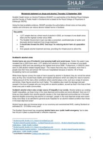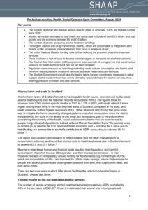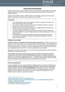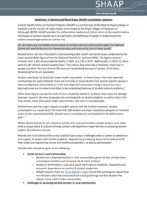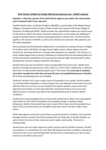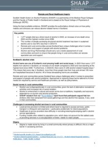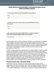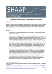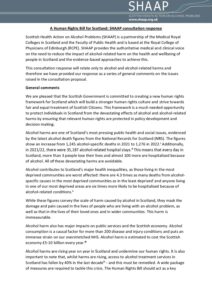 Positions Policy Joint AFS SHAAP letter to Neil Gray January 2025 Consultation Response Response to consultation on Right to Addiction Recovery (Scotland) Bill December 2024 Policy Remote and Rural Healthcare briefing December 2024 Policy Briefing for Budget November 2024 Consultation Response Response to the EU’s consultation on the Swedish alcohol monopoly October 2024 Policy Alcohol (In)justice Position Statement September 2024 Consultation Response Autumn budget: a submission on duty September 2024 Policy Briefing for Ministerial statement on drugs and alcohol September 2024 Consultation Response National Care Service Bill (Scotland) – Stage 2 consultation response August 2024 Policy Pre-budget scrutiny, Health, Social Care and Sport Committee August 2024 Consultation Response Draft Charter of Rights for People Affected by Substance Use June 2024 Policy The Cost of Alcohol to Scottish Society April 2024 Policy Joint Letter to HSCS Committee on MUP March 2024 Consultation Response Healthcare in Remote and Rural Areas: SHAAP consultation response October 2023 Policy Briefing on Calling Time October 2023 Consultation Response A Human Rights Bill for Scotland: SHAAP consultation response October 2023 Consultation Response Alcohol: Minimum Unit Pricing (MUP): Continuation and Future Pricing: SHAAP consultation response October 2023 Policy EASL Policy Statement: Reducing Alcohol Harms 2023 August 2023