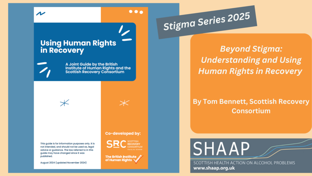 In our latest blog, Tom Bennett, Rights in Recovery Development Officer at the Scottish Recovery Consortium (SRC), discusses the importance of overcoming stigma to understand the human rights of people with alcohol problems when accessing support. SRC’s recent publication ‘Using Human Rights in Recovery – A Guide‘ invites all those impacted by addiction to become better informed about their human rights so they can advocate for themselves and others.